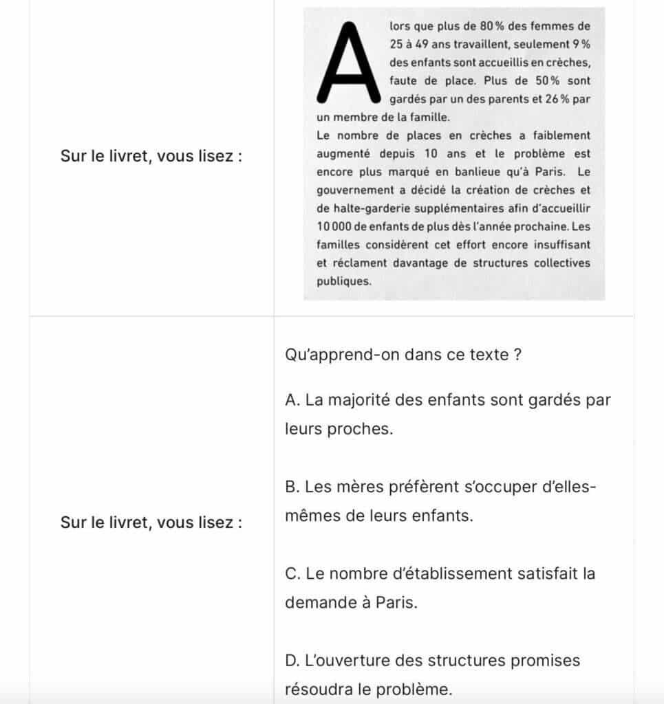 Additionally to being a native French teacher with 9 years of experience, I am also a TCF examiner so I’ll be the perfect person to prepare you to reach your objective at this Test de Connaissance du Français. You can read more information about it on the page “Preparation for DFP & TCF”. Here is an example of reading comprehension :